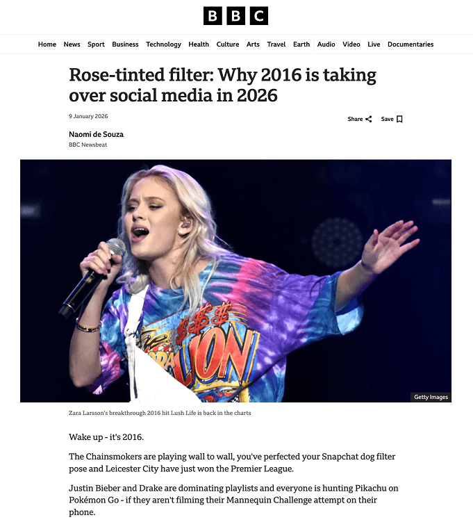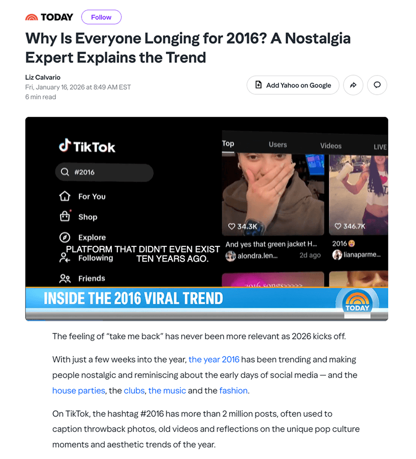 For older Gen Z and young Millennials, 2016 represents a cultural sweet spot—a time before the internet became hyper-optimized, monetized, and dictated by algorithms. Based on secondary research, we identified three core drivers behind this nostalgia: